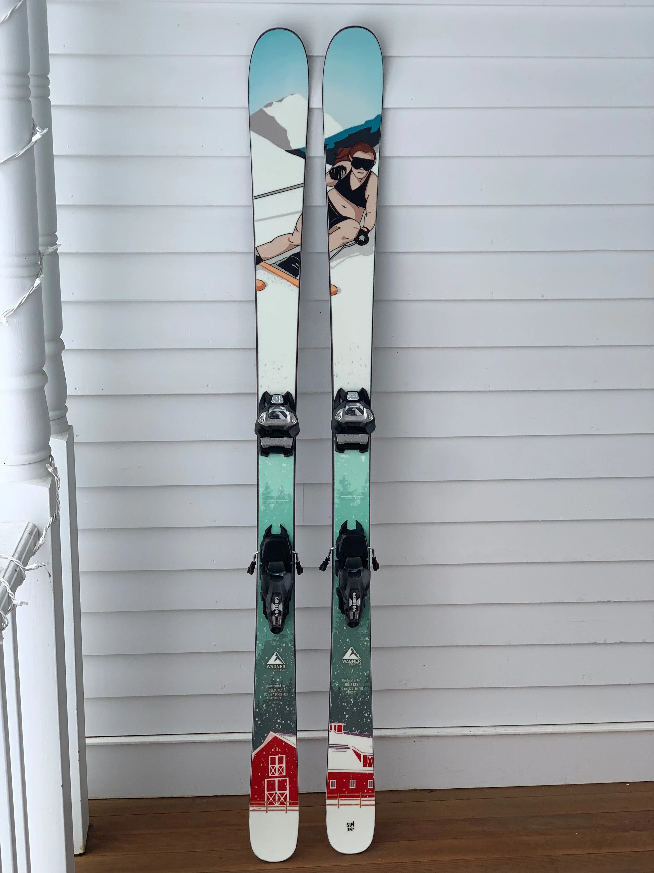 Commissioned by a client to design custom graphics for her new downhill Wagner Skis, I got to create these beauties. She grew up skiing in Vermont and hiking in Wyoming, and wanted a pair of skis that showed those two places that are so close to her heart. Additionally, her other passion in life is competitive weightlifting. She asked me to create something that combined all four of her loves: weightlifting, Wyoming, Vermont, and skiing to create a wearable utilitarian piece of art. What we came up with was a figure of a weightlifter skiing with Teton-esque mountains behind her on the tip, and a big red barn on the tail, which is based on her grandmother's barn in Vermont.